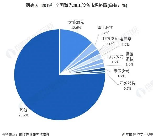 全国激光加工设备市场格局较为分散,全国激光加工设备TOP8占比仅为24.3%,市场集中度较低,排名首位的KOK官方版网站登录入口市占率也仅为12.6%,但是高于占比排名第二位的华工科技(占有率仅为2.8%)约10个百分比,呈现断崖式领先。