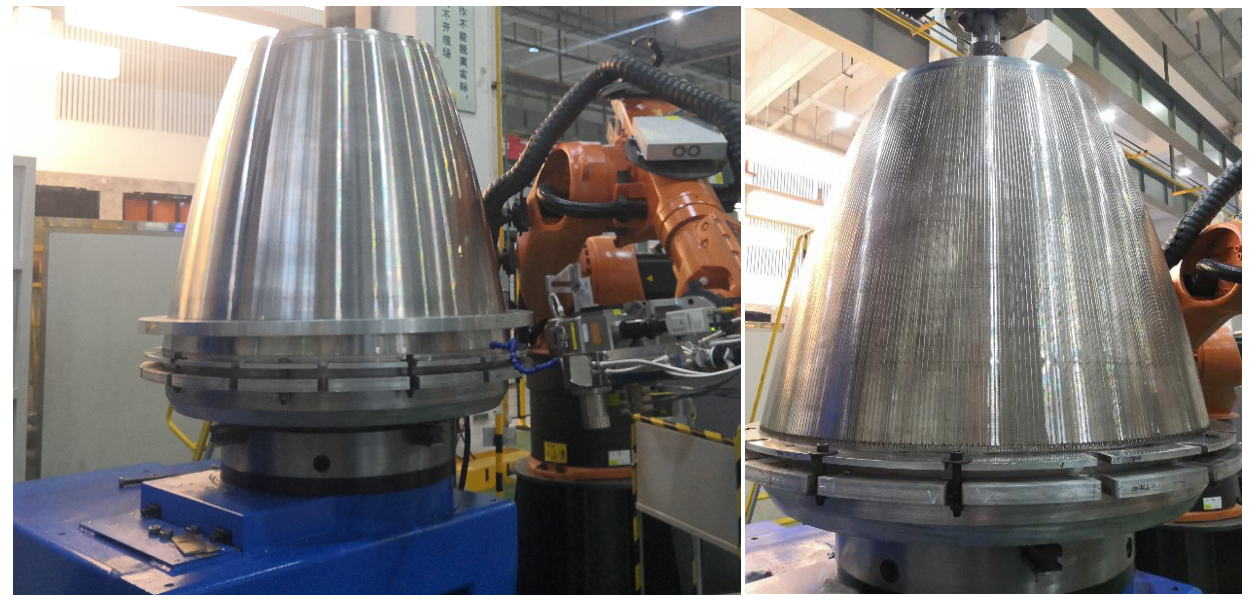 RK1Z激光焊接系统是大族智能装备集团高功率焊接KOK(中国)为大型火箭发动机等立式回转体激光焊接而开发的成套设备。整套设备最大焊接功率8000W,最大可焊深度10mm,最大可焊直径接近2m,可满足客户未来二级发动机、上面级发动机大面积比喷管焊接需求。经过大量的工艺探索已经成功实现了GH4169&镍、铬锆铜&1Cr18Ni9Ti等异种金属大型薄壁件的焊接。采用上述焊接工艺及装备,焊缝质量能满足客户需求的同时大大缩短了产品交期,极大降低了生产成本及对高水平焊接工人的依赖,其工艺水平达到了国内领先水平。